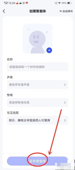 - 现在,您可以自定义智能体的外观、名称、性格、声音等属性,完成后点击"发布智能体"图标,即可创建成功。